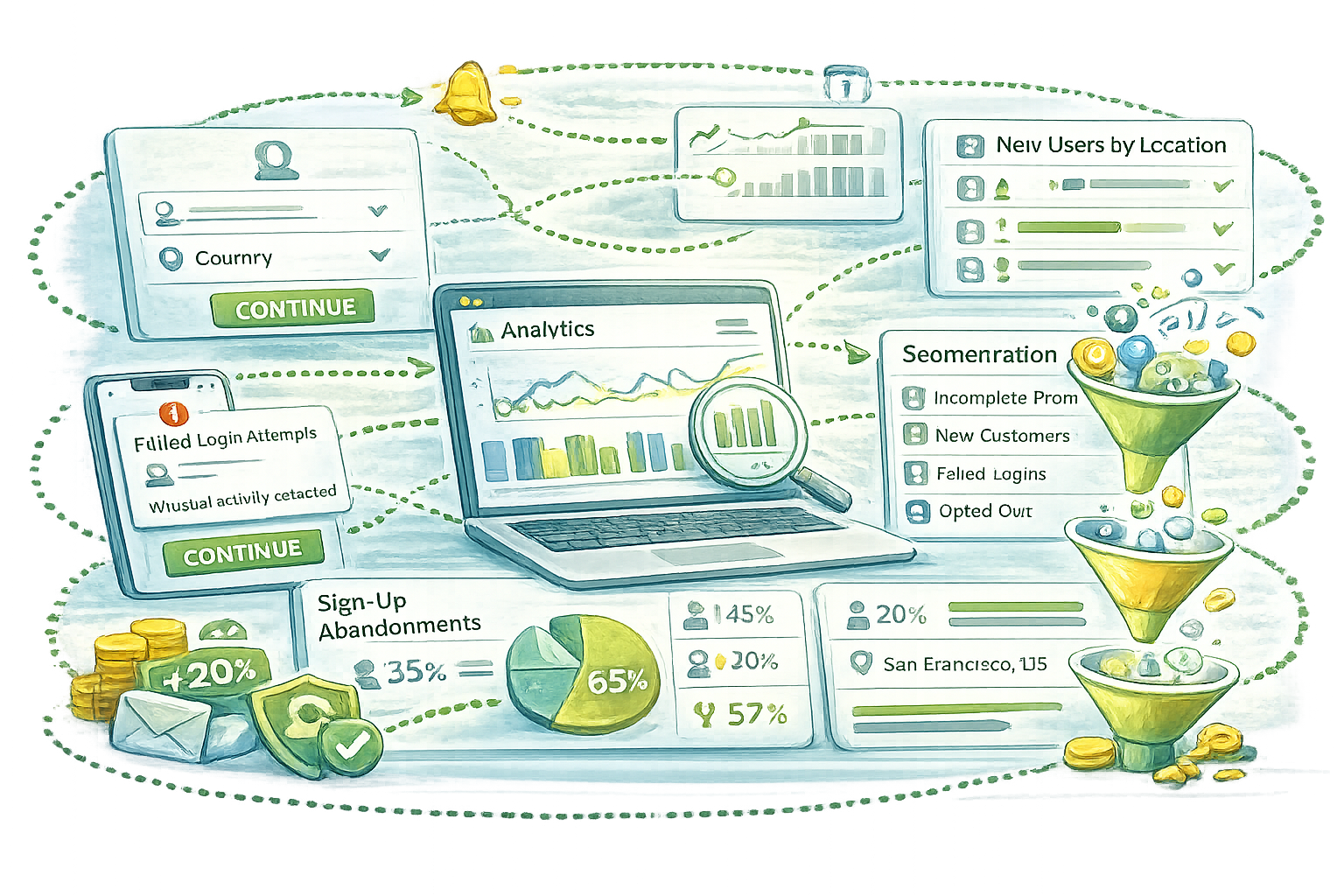 This delivers clearer segmentation and more precise campaign targeting by using behavioral and identity context (for example: new users who abandoned onboarding, customers with incomplete profiles, users repeatedly failing login, or users who opted out of specific communications). It also helps optimize experience and reduce risk by spotting suspicious login spikes, friction hotspots, and consent gaps early, while keeping reporting audit-ready for privacy expectations and governance.